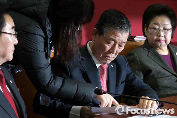 (서울=포커스뉴스) 황진하(오른쪽 두번째) 새누리당 사무총장이 20일 오전 서울 여의도 국회에서 열린 최고중진연석회의에 참석해 당직자와 대화하는 동안, 김을동(오른쪽) 최고위원과 김태원(왼쪽) 의원이 바라보고 있다.