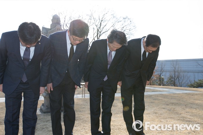 (서울=포커스뉴스) 한상진(오른쪽 두번째) 국민의당 창당준비위원장이 20일 오전 서울 용산구 백범 김구 선생 묘역에 인사를 하고 있다.