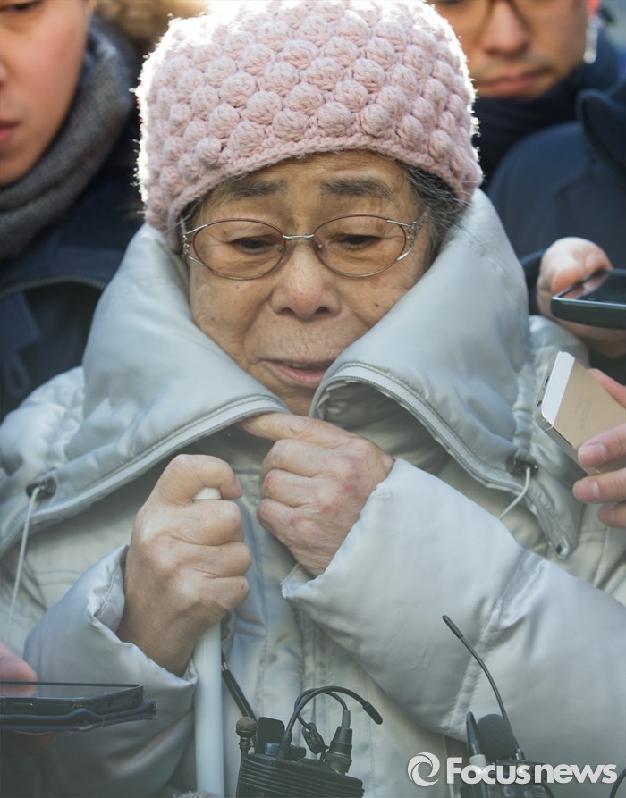 (서울=포커스뉴스) 책 '제국의 위안부'를 써 일본군 위안부 피해자들의 명예를 훼손했다는 혐의로 재판을 받게 된 박유하 세종대 국제학부 교수에 대한 공판이 열린 20일 오전 서울 광진구 동부지방법원에서 공판이 끝난 뒤 위안부 피해자 유희남 할머니가 취재진의 질문에 답변하고 있다.