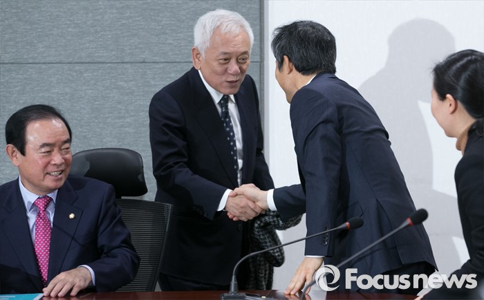 (서울=포커스뉴스) 20일 오전 서울 여의도 국회 의원회관에서 열린 국민의당 소속 의원단 회의에 참석한 김한길(왼쪽 두번째) 의원이 동료 의원들과 인사하고 있다.