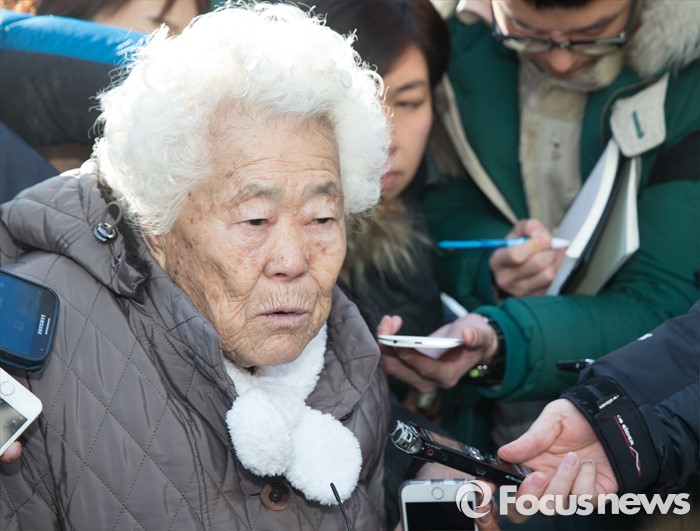 (서울=포커스뉴스) 책 '제국의 위안부'를 써 일본군 위안부 피해자들의 명예를 훼손했다는 혐의로 재판을 받게 된 박유하 세종대 국제학부 교수에 대한 공판이 열린 20일 오전 서울 광진구 동부지방법원에서 공판이 끝난 뒤 위안부 피해자 이옥선 할머니가 취재진의 질문에 답변하고 있다.