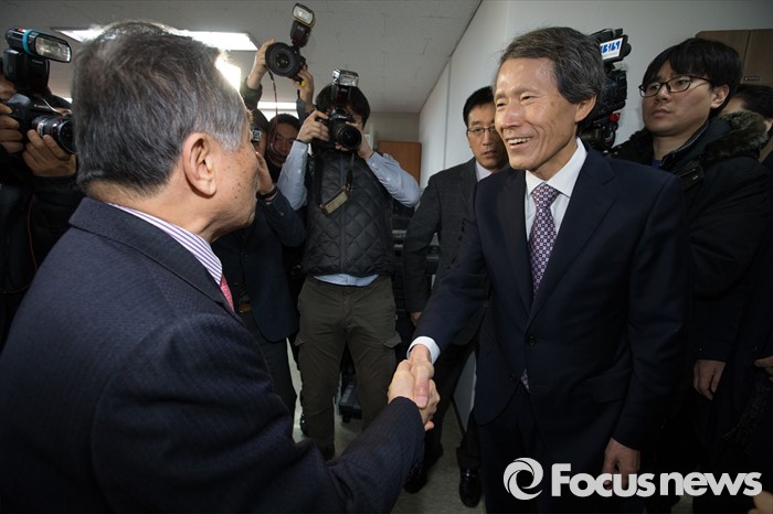 (서울=포커스뉴스) 한상진(오른쪽) 국민의당 창당준비위원장이 20일 오전 서울 여의도 광복회를 방문해 박유철 광복회장과 인사를 하고 있다.