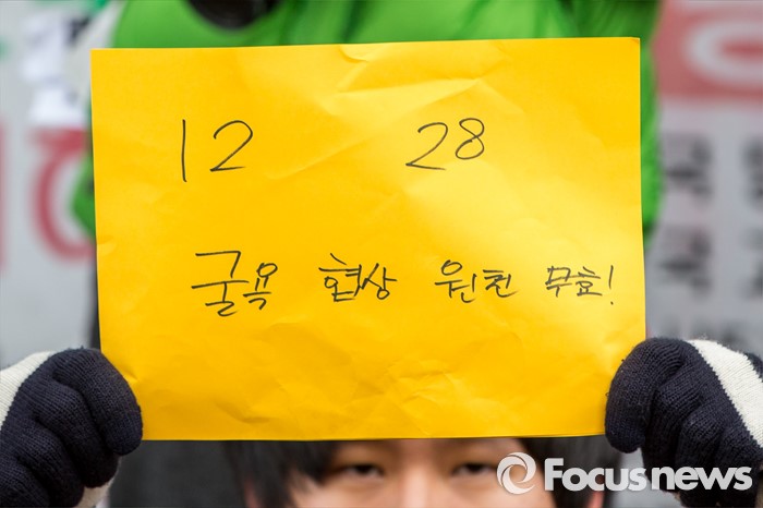 (서울=포커스뉴스) 20일 오후 서울 종로구 옛 일본대사관 앞에서 열린 제1214차 일본군 위안부 문제 해결 위한 정기수요시위에서 참가자들이 한일 위안부 합의 무효를 촉구 하고 있다. 이날 일본군 위안부 피해자 할머니들은 연이은 혹한으로 시위에 자리하지 못했다.