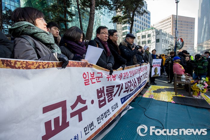 (서울=포커스뉴스) 20일 오전 서울 종로구 일본대사관 인근에서 민주사회를 위한 변호사모임 관계자들이 일본군 위안부 문제 관련 한일외교장관회담에 대한 교수, 법률가 의견서 발표 기자회견을 하고 있다.