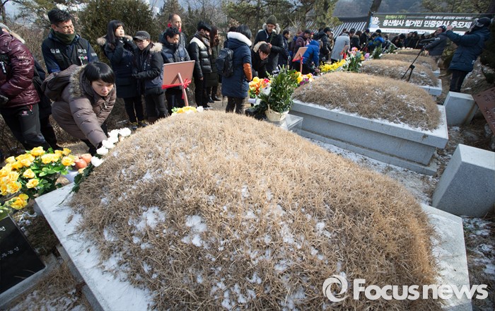 (남양주=포커스뉴스) 20일 오후 경기도 남양주시 모란공원묘지에서 열린 '용산참사 7주기 철거민 민중열사 추모제'에서 용산참사7주기 추모위원회를 비롯한 유족들이 헌화를 하고 있다.