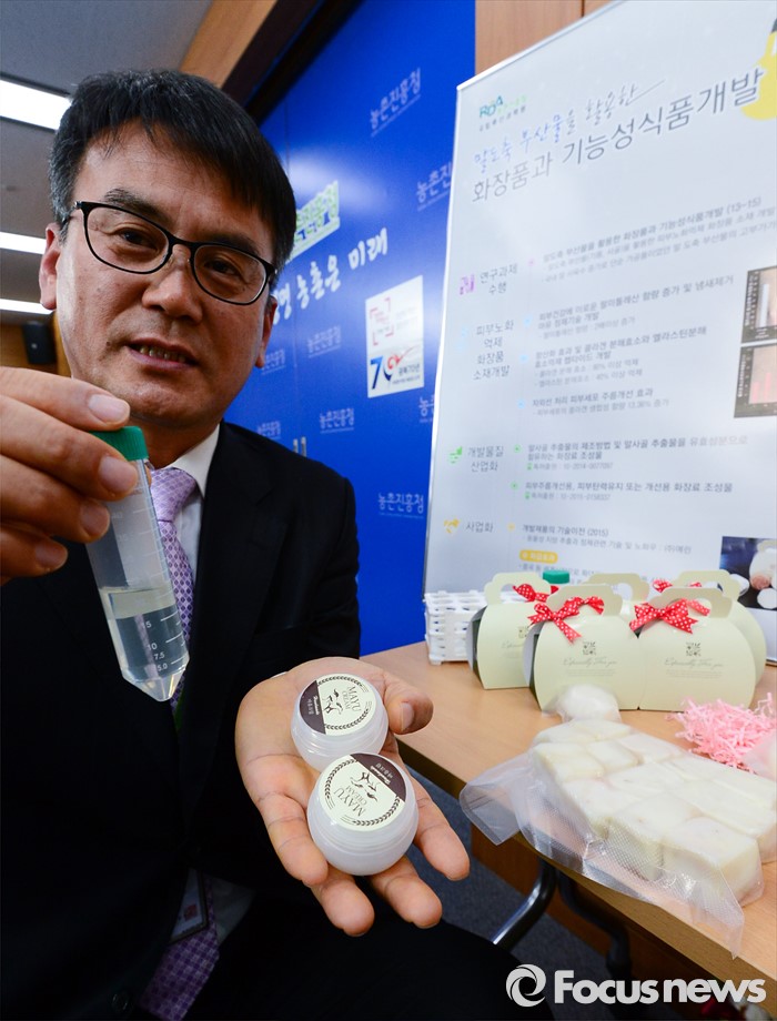 (세종=포커스뉴스) 박남건 농촌진흥청 국립축산과학원 난지축산연구소장이 20일 오전 세종시 정부세종청사 농림축산식품부 기자실에서 말(馬)기름과 말뼈로 피부노화 억제 기능이 있는 화장품 소재 개발 브리핑을 마치고 제품을 선보이고 있다.