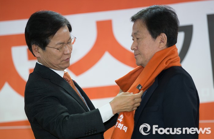 (서울=포커스뉴스) 국민회의 천정배 창당준비위원장이 20일 오후 서울 여의도 국민회의 당사에서 열린 인재 입당식에서 통일/노동 분야 5명의 인사들에게 목도리를 선물하고 있다.