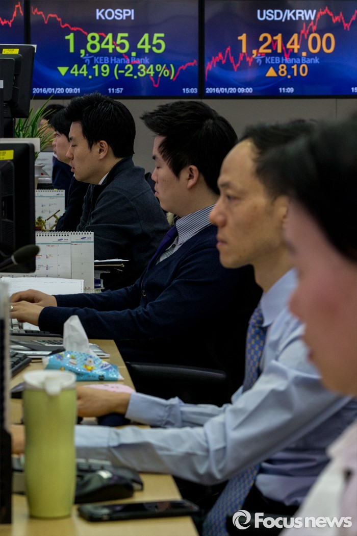 (서울=포커스뉴스) 코스피 지수가 외국인과 기관의 매도 공세에 전 거래일보다 44.19포인트(2.34%) 하락한 1,845.45에 거래를 마친 20일 오후 서울 중구 KEB하나은행 딜링룸에서 딜러들이 업무를 보고 있다. 이날 원달러 환율은 전 거래일보다 8.1원 오른 1214원에 거래를 마감했다.