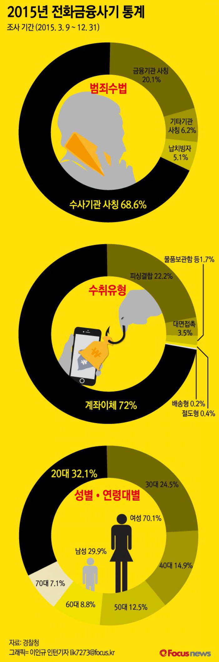 범죄수법은 검찰과 경찰, 국가정보원, 금융감독원 등을 사칭하는 고전적인 수법이 68%로 가장 많았다.