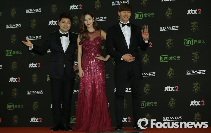 (서울=포커스뉴스) 20일 서울 동대문구 경희대학교 평화의 전당에서 열린 제 30회 골든디스크 시상식에 참석한 방송인 전현무(왼쪽부터), 가수 서현, 김종국이 포토타임을 갖고 있다.