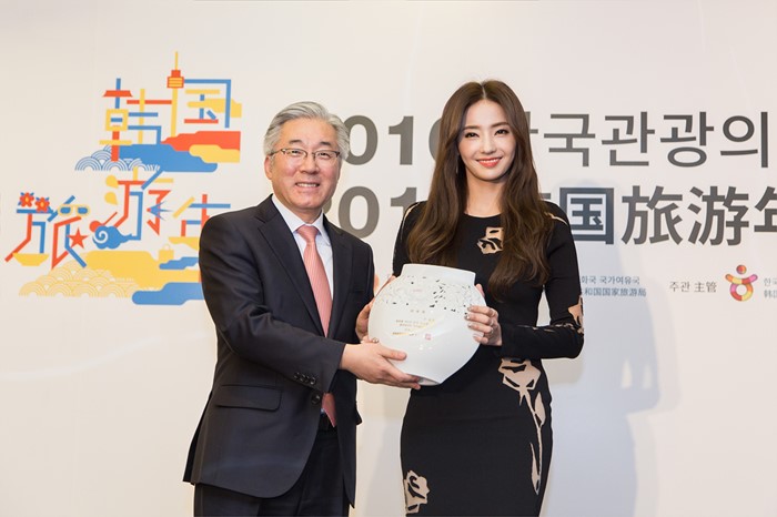 (서울=포커스뉴스) 김종덕 문화체육관광부장관이 20일 중국 베이징 21세기극장에서 열린 2016 한국관광의 해 개막행사을 앞두고 열린 기자간담회에서 배우 한채영과 홍보대사 위촉패를 전달하고 기념촬영하고 있다. <사진제공=문화체육관광부>