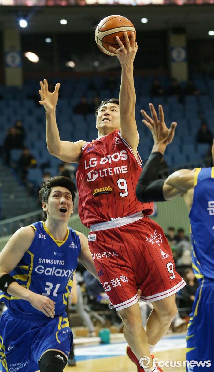 (서울=포커스뉴스) 20일 서울 잠실실내체육관에서 열린 2015-2016 프로농구 삼성-LG 경기에서 LG 김영환이 삼성 장민국의 마크를 뚫고 레이업슛을 시도하고 있다.