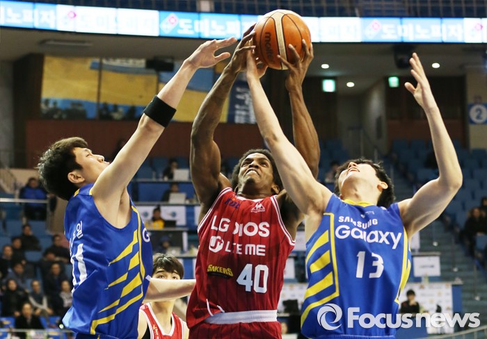 (서울=포커스뉴스) 20일 서울 잠실실내체육관에서 열린 2015-2016 프로농구 삼성-LG 경기에서 LG 샤크가 삼성 김준일과 임동섭 사이에서 리바운드볼을 잡고 있다.