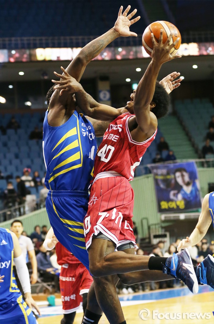 (서울=포커스뉴스) 20일 서울 잠실실내체육관에서 열린 2015-2016 프로농구 삼성-LG 경기에서 LG 샤크가 삼성 라틀리프의 수비를 제치며 점프슛을 시도하고 있다.