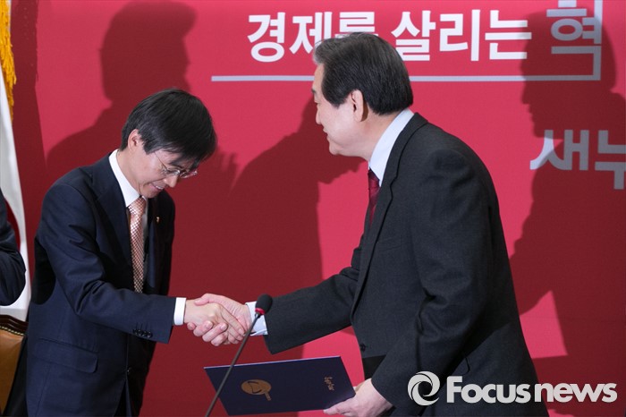 (서울=포커스뉴스) 더불어민주당을 탈당한 조경태(왼쪽) 의원이 21일 오전 서울 여의도 국회에서 열린 새누리당 최고위원회의에 참석해 김무성 대표에게 입당 원서를 전달하고 있다.