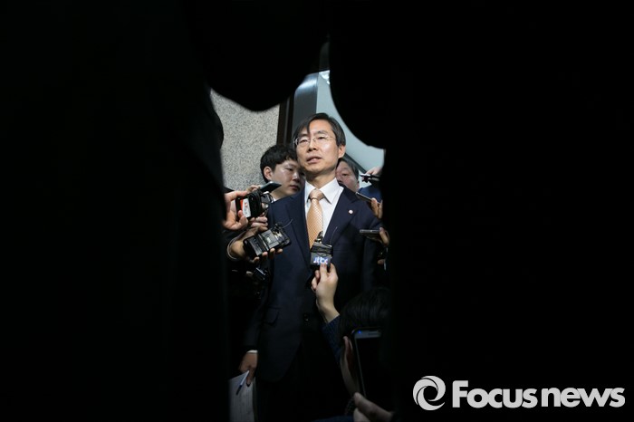(서울=포커스뉴스) 더불어민주당을 탈당한 조경태 의원이 21일 오전 서울 여의도 국회에서 열린 새누리당 최고위원회의에 참석해 입당원서를 제출한 뒤 기자질문에 답변하고 있다.