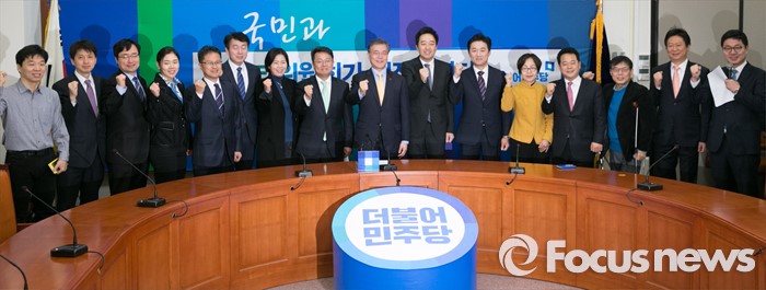 (서울=포커스뉴스) 21일 오전 서울 여의도 국회에서 열린 더불어민주당 뉴파티특별위원회 출범 회의에 앞서 문재인 대표, 이철희 두문정치연구소장, 금태섭 변호사, 양향자 전 삼성전자 상무, 기동진 전 서울시 정무부시장 등 참석자들이 취재진을 위해 포즈를 취하고 있다.