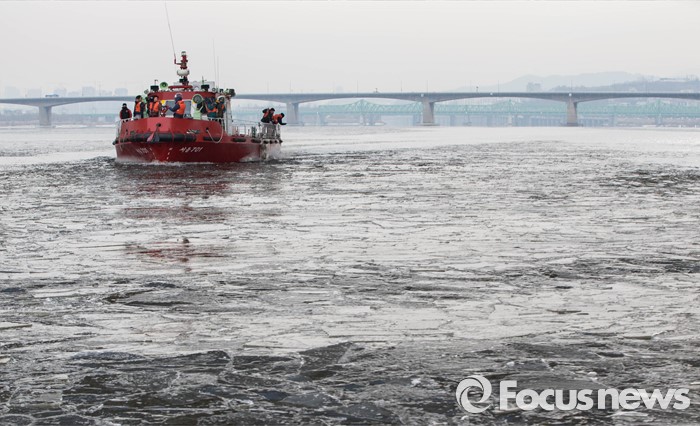 (서울=포커스뉴스) 절기상 '대한' 이며 한강이 공식 결빙된 것으로 발표된 21일 오전 서울 영등포구 여의도동 한강에서 119 특수구조단 수난구조대 대원들이 수난구조정을 동원해 쇄빙작업을 하고 있다. 한강 결빙 관측은 한강대교 노량진 방향 2번째와 4번째 교각 사이에서 이루어지며 상류 쪽으로 100m 부근의 남북 간 띠 모양 지점이 얼었는지에 따라 결빙 여부를 판정한다.