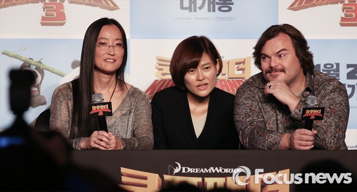 (서울=포커스뉴스) 21일 오전 서울 영등포구 콘래드 서울호텔에서 열린 쿵푸팬더3 기자간담회에 참석한 여인영 감독(왼쪽)과 배우 잭 블랙이 취재진을 바라보고 있다.