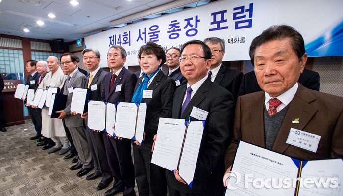 (서울=포커스뉴스) 21일 오전 서울 중구 프레스센터에서 열린 '제4회 서울 총장 포럼'에 자리한 서울 지역 대학 총장들이 국제적 경쟁력 확보 및 예산 절감, 대학의 재정적 위기상황 공동대응, 교육프로그램 공유 등이 담긴 '서울 총장 포럼 회원대학 학술교류협정서'에 서명을 마친 뒤 사진촬영을 하고 있다.