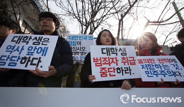 (서울=포커스뉴스) 한일 위안부 협상 폐기를 요구하며 주한일본대사관 앞 '평화의 소녀상' 인근에서 노숙 농성과 집회를 벌인 혐의로 출석요구서를 받은 대학생들이 21일 오후 서울 종로경찰서 앞에서 '소녀상을 지키는 대학생 표적수사 규탄 기자회견'을 하고 있다.