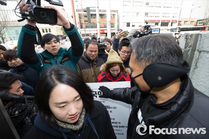 (서울=포커스뉴스) 한일 위안부 협상 폐기를 요구하며 주한일본대사관 앞 '평화의 소녀상' 인근에서 노숙 농성과 집회를 벌인 혐의로 출석요구서를 받은 대학생들이 21일 오후 서울 종로경찰서 앞에서 '소녀상을 지키는 대학생 표적수사 규탄 기자회견'을 끝내고 경찰서로 출석하고 있다.