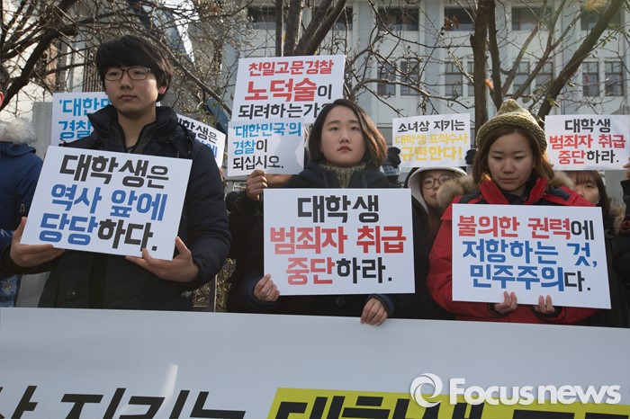 (서울=포커스뉴스) 한일 위안부 협상 폐기를 요구하며 주한일본대사관 앞 '평화의 소녀상' 인근에서 노숙 농성과 집회를 벌인 혐의로 출석요구서를 받은 대학생들이 21일 오후 서울 종로경찰서 앞에서 '소녀상을 지키는 대학생 표적수사 규탄 기자회견'을 하고 있다.