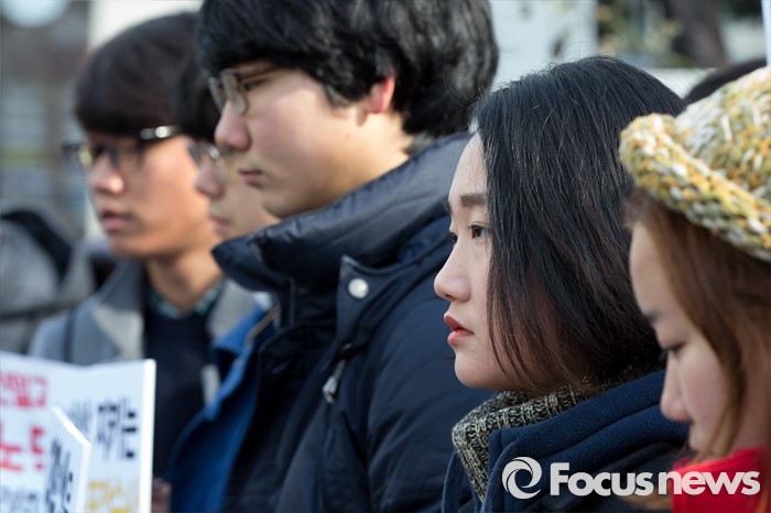 (서울=포커스뉴스) 한일 위안부 협상 폐기를 요구하며 주한일본대사관 앞 '평화의 소녀상' 인근에서 노숙 농성과 집회를 벌인 혐의로 출석요구서를 받은 대학생들이 21일 오후 서울 종로경찰서 앞에서 '소녀상을 지키는 대학생 표적수사 규탄 기자회견'을 하고 있다.