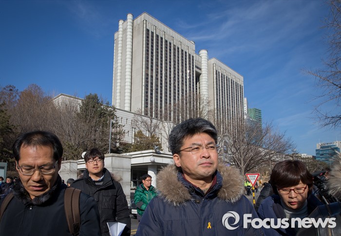(서울=포커스뉴스) 21일 오후 서울 서초구 서울중앙지방법원 인근에서 열린 법외노조 통보처분 취소청구 고법 판결에 대한 전교조 입장 발표 기자회견을 마친 변성호(가운데) 전국교직원노동조합 위원장이 발걸음을 옮기고 있다.
