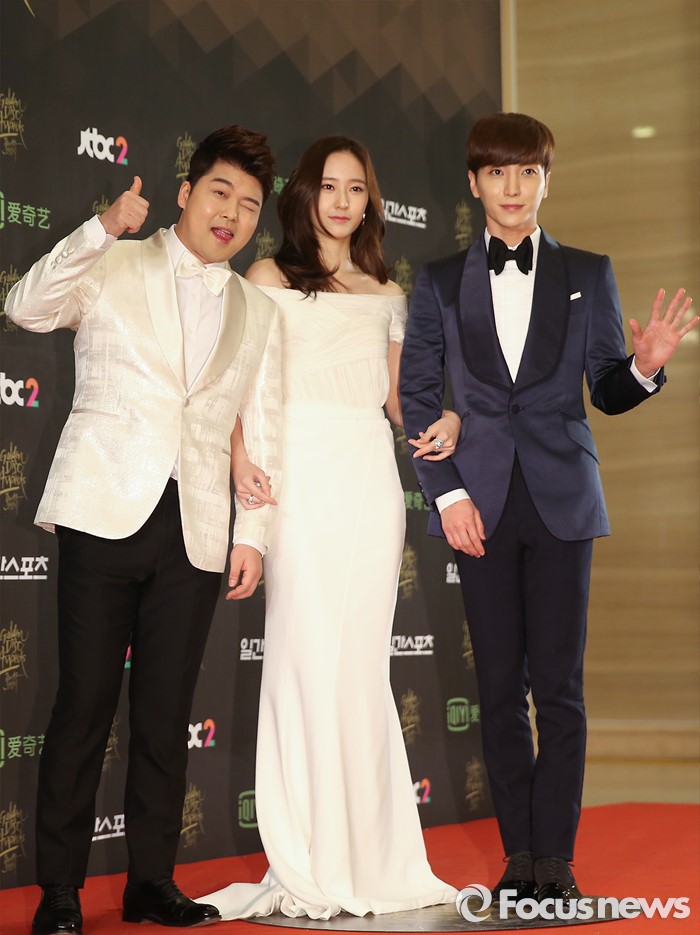 (서울=포커스뉴스) 21일 서울 동대문구 경희대학교 평화의 전당에서 열린 제 30회 골든디스크 시상식에 참석한 방송인 전현무, 가수 크리스탈, 이특이 포토타임을 갖고 있다.