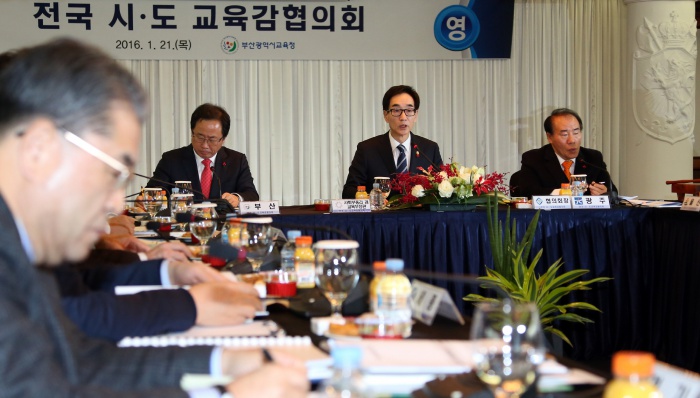 (부산=포커스뉴스) 이준식 교육부 장관이 21일 오후 부산 해운대 그랜드호텔에서 열린 전국 시·도교육감협의회 총회에 참석해 질문에 답변하고 있다. 이날 총회는 누리과정 예산 및 총회 상정 안건, 사무국 제안 안건 등을 논의했다. <사진제공=교육부>