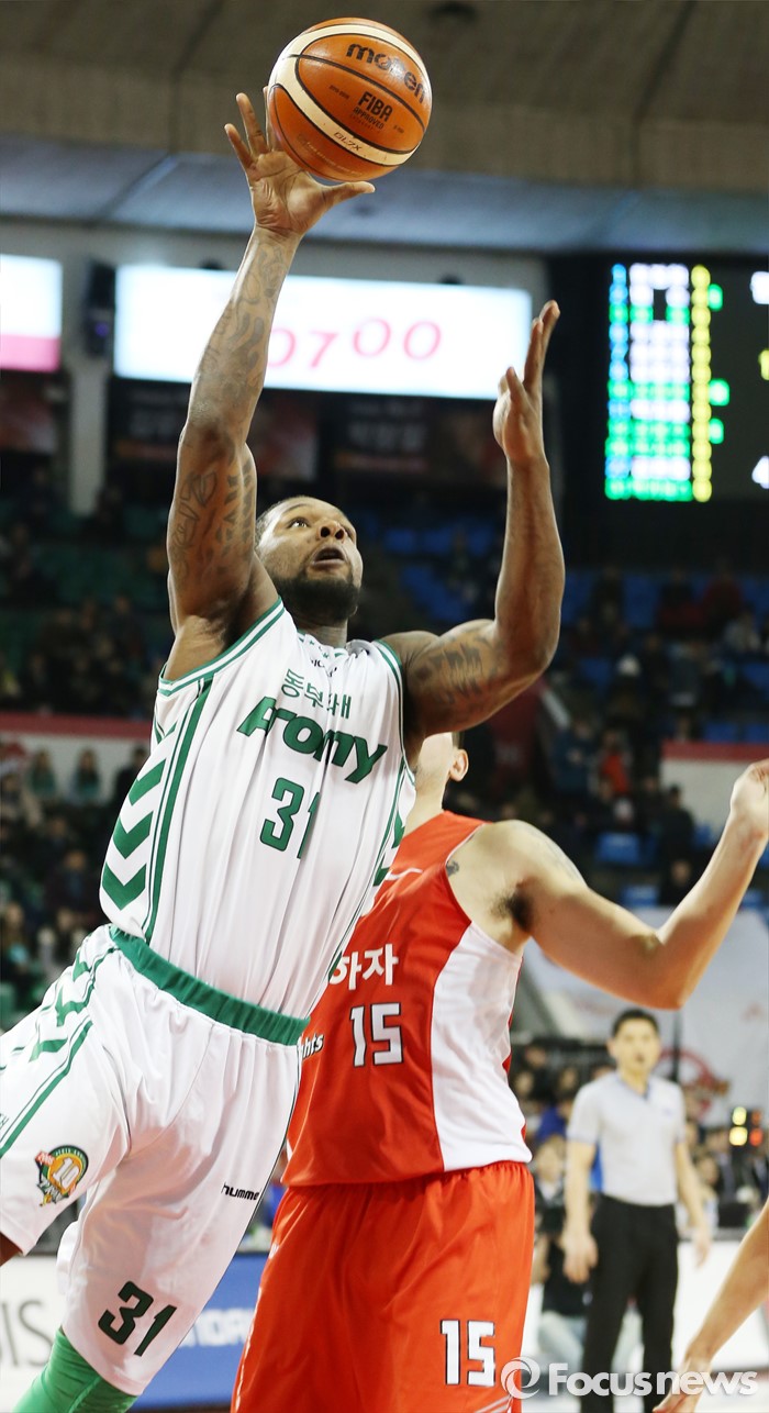 (서울=포커스뉴스) 21일 서울 잠실학생체육관에서 열린 2015-2016 프로농구 SK-동부 경기에서 동부 맥키네스가 SK 김민수를 제치고 점프슛을 하고 있다.