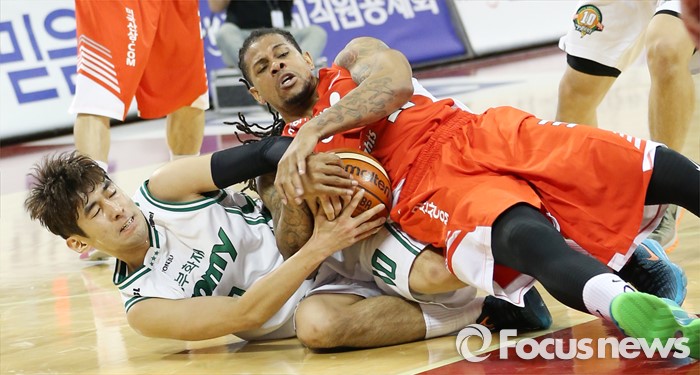 (서울=포커스뉴스) 21일 서울 잠실학생체육관에서 열린 2015-2016 프로농구 SK-동부 경기에서 SK의 새로운 외국인 선수 미첼과 동부 김종범이 치열한 볼 다툼을 하고 있다.