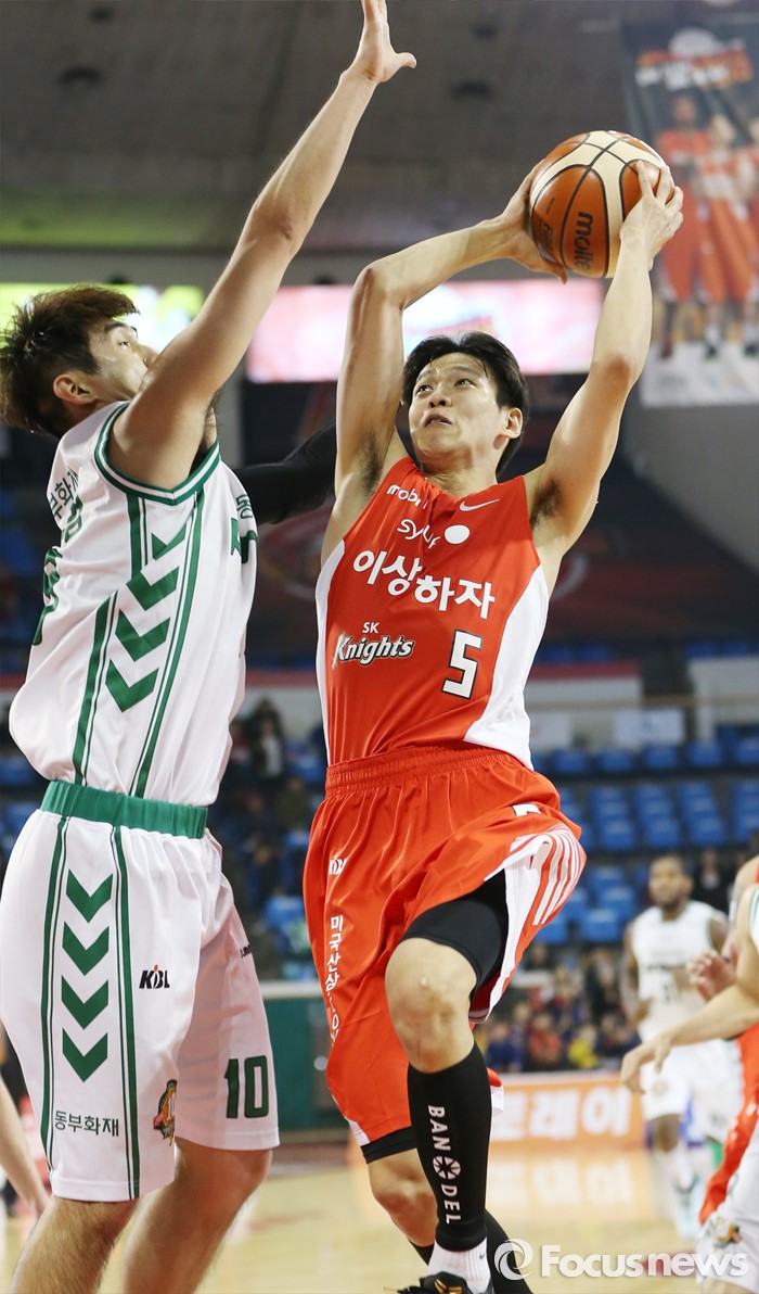 (서울=포커스뉴스) 21일 서울 잠실학생체육관에서 열린 2015-2016 프로농구 SK-동부 경기에서 SK 김선형이 동부 김종범의 수비를 앞에 두고 레이업슛을 시도하고 있다.
