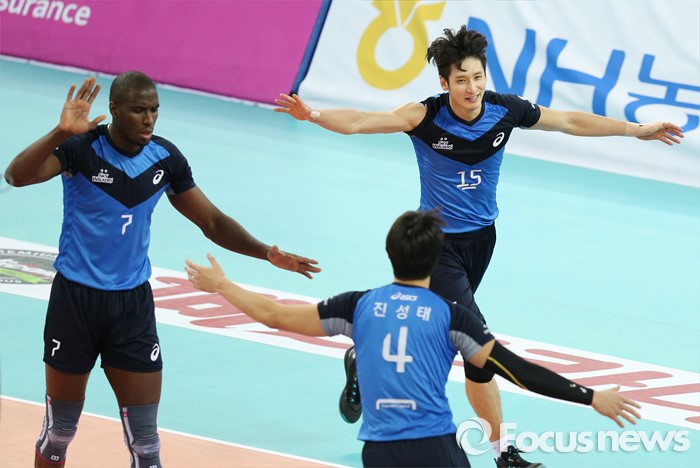 현대캐피탈은 군에서 제대한 신영석을 활용할 수 있다는 점에서 앞으로 전력에 플러스 요인이 있다. 신영석은 이날 처음 현대캐피탈 유니폼을 입고 경기에 나섰다.(인천=포커스뉴스) 12일 인천 계양체육관에서 열린 '2015-2016NH농협 V-리그' 남자부 대한항공-현대캐피탈 경기에서 현대캐피탈 문성민(15)이 블로킹으로 득점을 올리고 환호하고 있다. 2016.01.12 우정식 기자