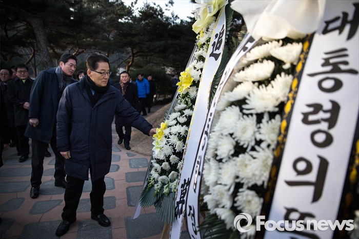 (서울=포커스뉴스) 더불어민주당 탈당을 예고한 박지원 전 원내대표가 22일 오전 서울 동작구 국립서울현충원 故 김대중 전 대통령 묘역을 방문, 자신이 보낸 화환을 살펴보고 있다.
