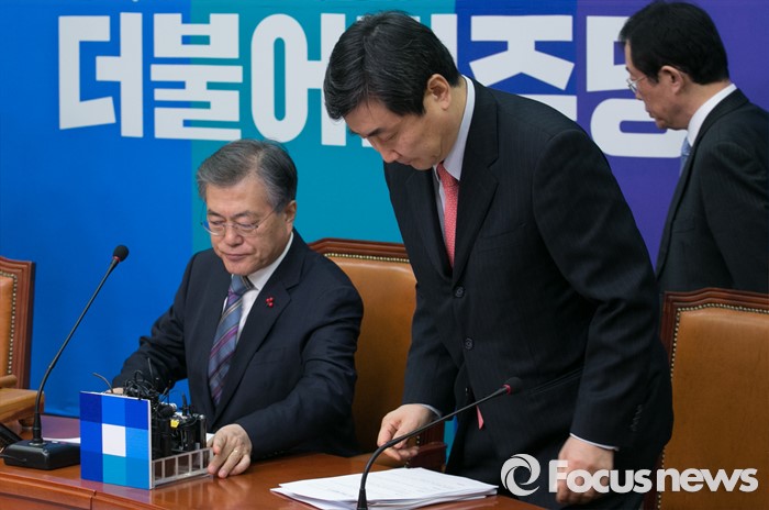 (서울=포커스뉴스) 문재인(왼쪽) 더불어민주당 대표와 이종걸 원내대표가 22일 오전 서울 여의도 국회에서 열린 최고위원회의에 참석하고 있다.