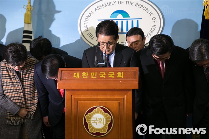 (서울=포커스뉴스) 박지원(가운데) 더불어민주당 의원이 22일 오전 서울 여의도 국회 정론관에서 탈당을 표명한 뒤, 인사하고 있다.