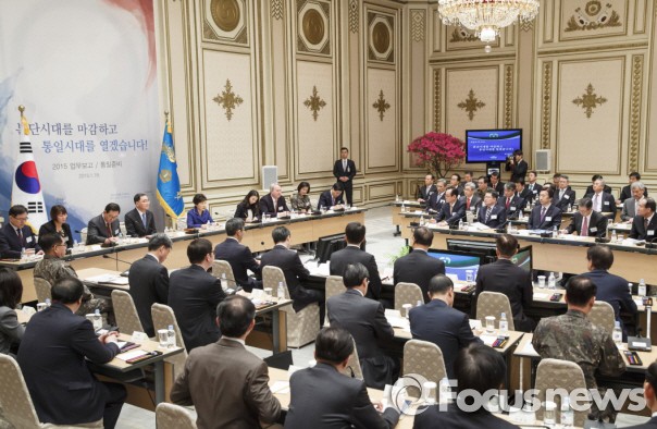 홍 장관은 이를 위해 "북한의 도발에는 단호하게 대응하고 올바른 선택에는 협력하는 한반도 신뢰프로세스 워닉과 일관성을 견지하고 통일 준비를 지속해 국내외 통일 열기를 확산시켜 나가겠다"고 강조했다.박근혜 대통령은 22일 오전 청와대 영빈관에서 외교부, 국방부, 통일부 합동 '2016년 외교·안보·통일 분야' 업무계획을 보고받았다. 사진은 작년 통일준비업무보고 전경. 2015.01.19. <사진출처=청와대>