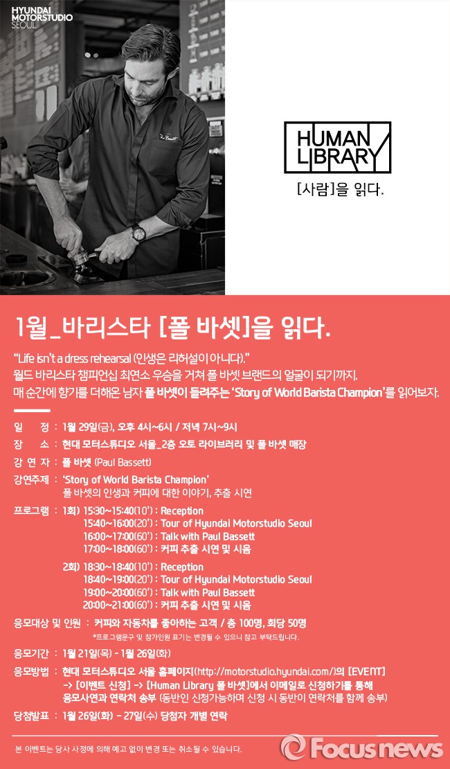 강연에 참가하려면 오는 26일까지 현대 모터스튜디오 홈페이지에 응모하면 된다. 현대차가 27일까지 참가자 100명을 추첨해 개별 통보한다.현대차의 바리스타 폴 바셋 초청 강연 포스터. <사진제공=현대차그룹> 2016.1.22. 김현이 인턴기자