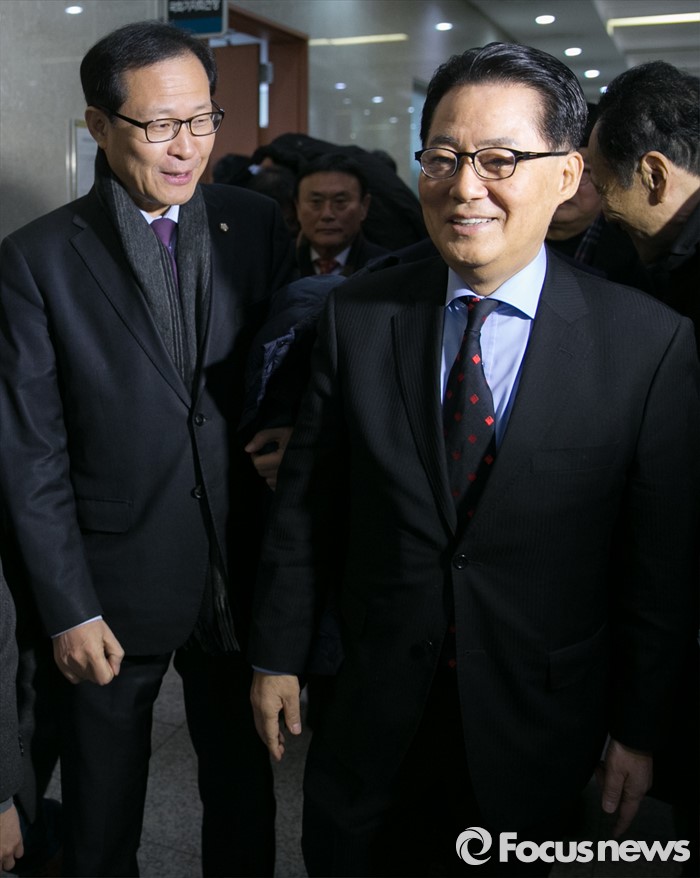 (서울=포커스뉴스) 박지원(오른쪽) 더불어민주당 의원이 22일 오전 서울 여의도 국회에서 탈당 기자회견을 위해 이동하고 있다. 왼쪽은 국민의당 소속 문병호 의원.