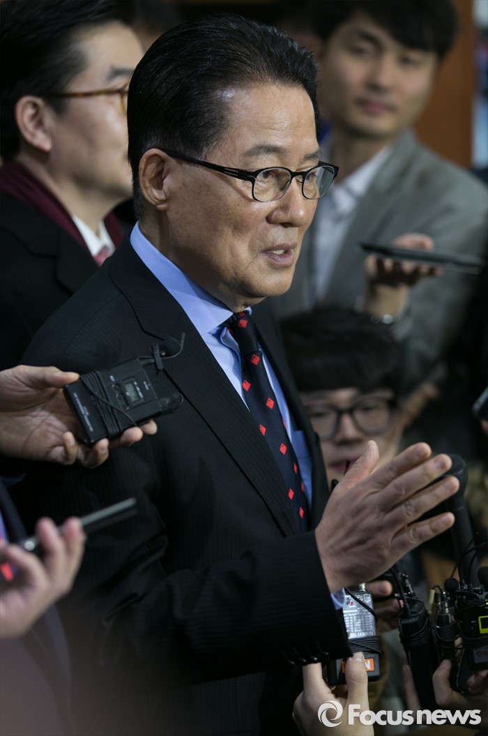 (서울=포커스뉴스) 박지원 더불어민주당 의원이 22일 오전 서울 여의도 국회 정론관에서 탈당 기자회견을 마친 뒤 취재진 질문에 답하고 있다.