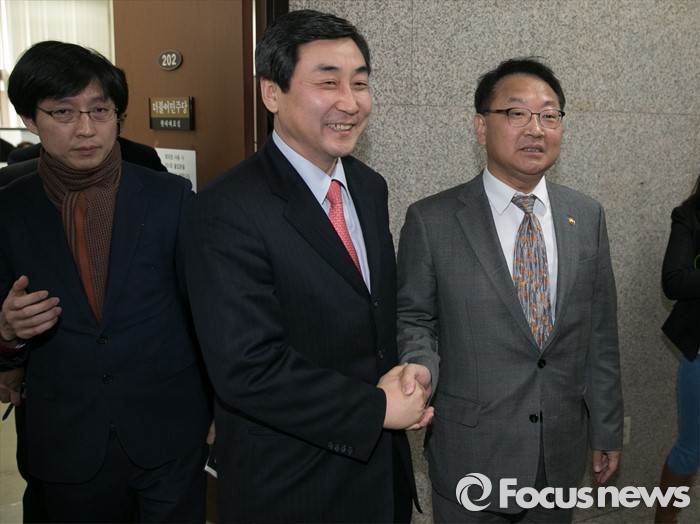 (서울=포커스뉴스) 유일호(오른쪽) 경제부총리 겸 기획재정부 장관이 22일 오전 서울 여의도 국회를 방문해 이종걸 더불어민주당 원내대표와 비공개 면담한 뒤 취재진을 향해 포즈를 취하고 있다.
