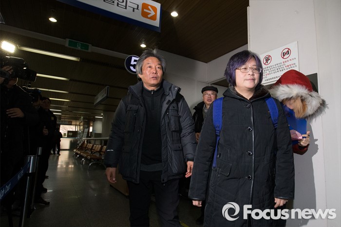 (서울=포커스뉴스) 박래군(왼쪽) 4·16연대 상임운영위원과 김혜진 운영위원이 22일 오전 서울 서초구 서울중앙지방법원에서 열린 선고 공판을 마친 뒤 법정을 나오고 있다.