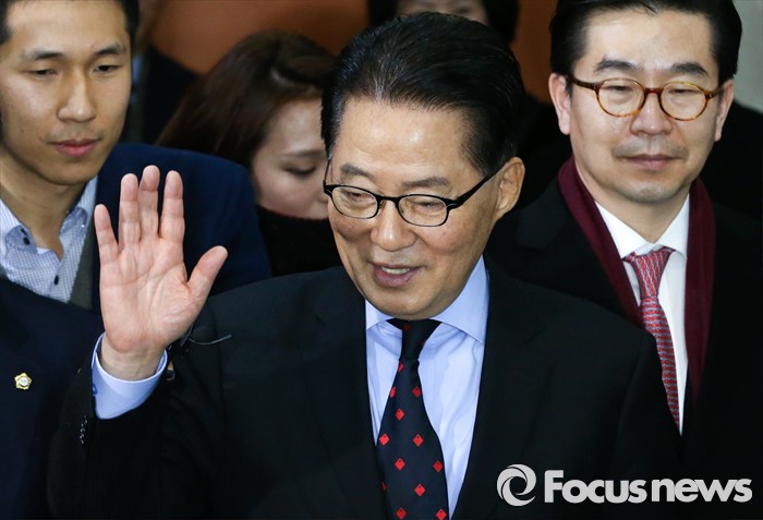 (서울=포커스뉴스) 박지원 더불어민주당 의원이 22일 오전 서울 여의도 국회 정론관에서 탈당 기자회견을 마친 뒤 손을 흔들고 있다.