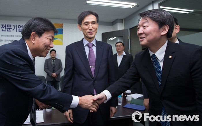 (서울=포커스뉴스) 국민의당(가칭) 안철수 의원이 22일 오후 서울 구로구 한국상용 SW협회에서 열린 SW전문기업인들과의 간담회에서 기업인들과 인사를 나누고 있다.