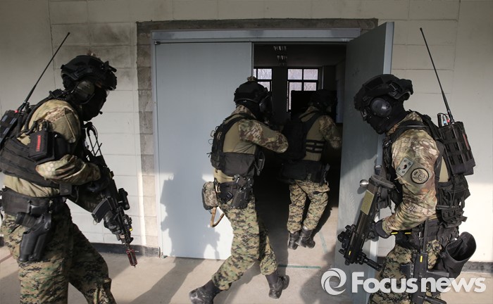 (서울=포커스뉴스) 김신조 청와대 침투사건인 ‘1·21사태’ 48주년을 맞아 서울경찰청·소방재난본부·수도방위사령부가 합동으로 수도 서울을 지키기 위한 테러 진압 훈련을 실시한 22일 서울 서초구 경찰특공대 훈련장에서 군 테러 진압 부대가 인질범 진압 작전을 펼치고 있다.