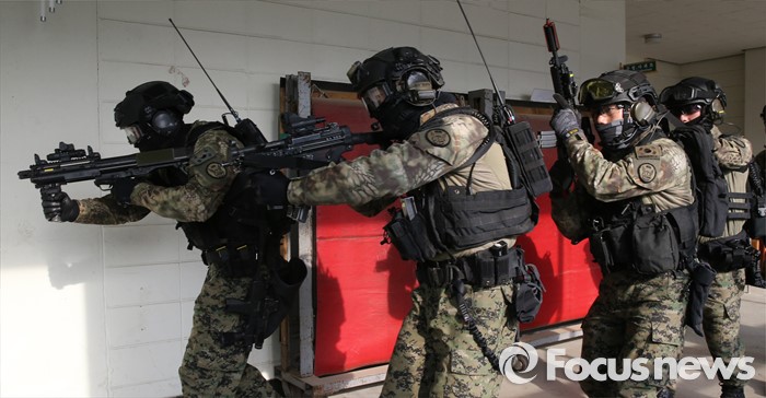 (서울=포커스뉴스) 김신조 청와대 침투사건인 ‘1·21사태’ 48주년을 맞아 서울경찰청·소방재난본부·수도방위사령부가 합동으로 수도 서울을 지키기 위한 테러 진압 훈련을 실시한 22일 서울 서초구 경찰특공대 훈련장에서 군 테러 진압 부대가 인질범 진압 작전을 펼치고 있다.