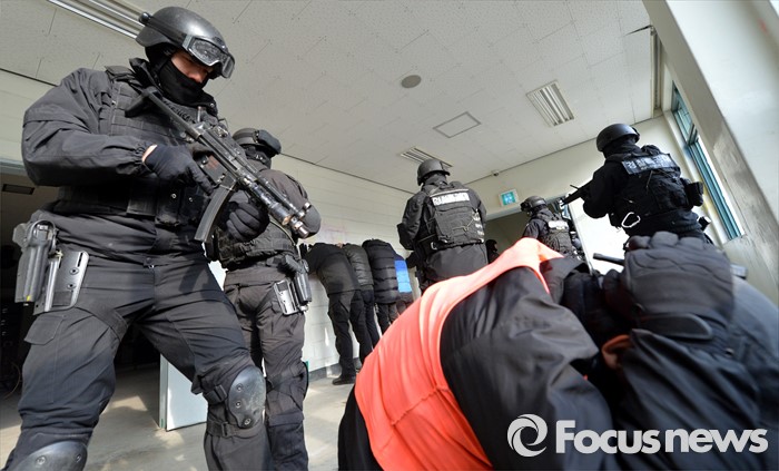 (서울=포커스뉴스) 김신조 청와대 침투사건인 ‘1·21사태’ 48주년을 맞아 서울경찰청·소방재난본부·수도방위사령부가 합동으로 수도 서울을 지키기 위한 테러 진압 훈련을 실시한 22일 서울 서초구 경찰특공대 훈련장에서 군 테러 진압 부대와 경찰특공대 대원들이 인질범 진압 작전을 펼치고 있다.
