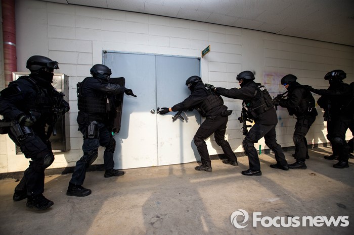 (서울=포커스뉴스) 22일 오후 서울 경찰특공대 훈련장에서 테러상황에 대비한 경찰, 소방, 군 전력이 함께 한 합동훈련이 실시된 가운데 경찰특공대 대원들이 테러범에 의한 인질상항 등을 가정한 훈련을 진행하고 있다.